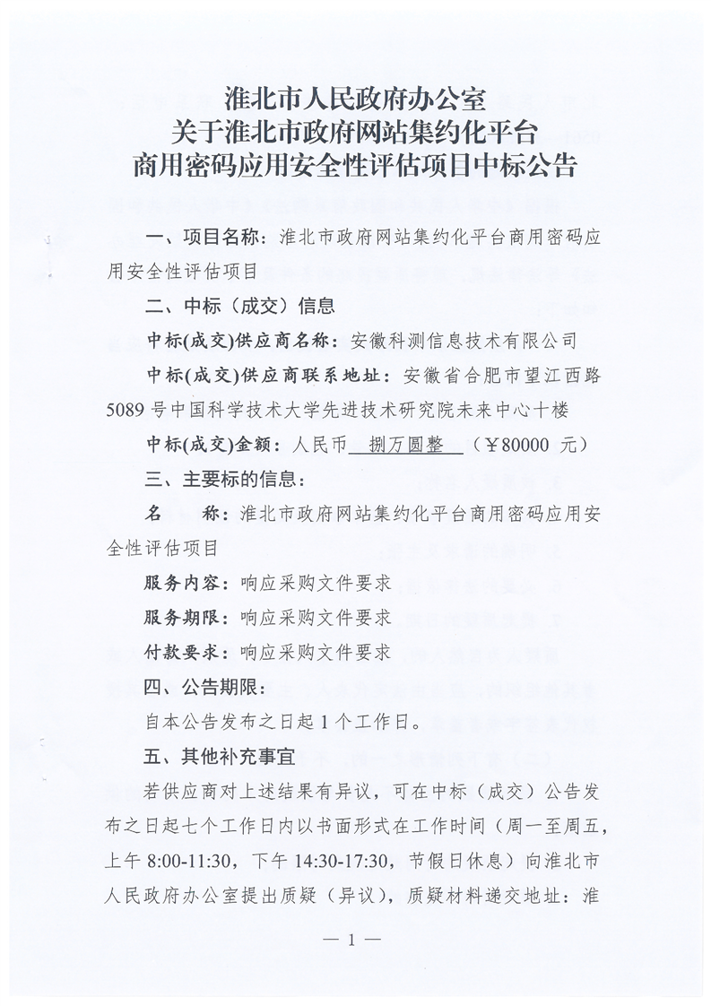 淮北市人民政府办公室关于淮北市政府网站集约化平台商用密码应用安全性评估项目中标公告