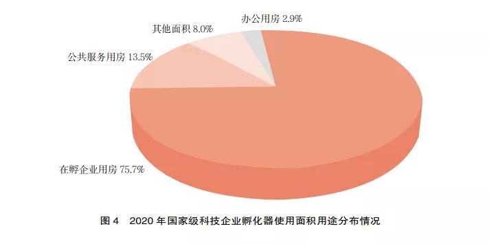 国家高新区具有创业孵化和内生增长的先天基因,在支持大众创业万众创新方面具有绝对的先天优势。截至2020年年底,169家国家高新区内共有国家级科技企业孵化器739家,占到国家级孵化器总数的56.6%;科技企业加速器888家。国家高新区内科技企业孵化器和加速器总面积分别为8232.9万平方米和7330.4万平方米,其中国家级科技企业孵化器75.7%的面积供在孵企业使用(参见图4),占比较上年进一步提升。国家高新区持续集聚和积累创新创业要素资源,科技企业孵化器、加速器为各类创业主体注入了鲜活动力。统计数据显示,纳入统计的710家国家级科技企业孵化器内共有在孵企业5.9万家,其中当年新增在孵企业1.5万家,累计毕业企业6.9万家。710家国家级科技企业孵化器内在孵企业从业人员88.3万人,较2019年增长1.6万人;当年吸纳应届毕业生7.9万人,占从业人员比重的8.9%。
