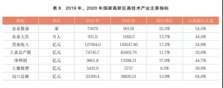 国家高新区自创建以来,始终坚持以“发展高科技、实现产业化”为使命,不断加强技术创新,把科学技术转变为现实生产力,实现高新区产业发展的多样化和高端化,把高新区建设成产业高地。以高技术制造业和高技术服务业共同构成的高技术产业已经成为国家高新区产业的重要构成部分。2020年,169家国家高新区中属于高技术产业的企业达90129家,占高新区企业总数的54.5%;从业人员达1059.3万人,占高新区从业人员总数的44.4%。2020年高技术产业创造的营业收入、工业总产值、净利润、上缴税费和出口总额分别为149547.80亿元、83463.76亿元、13598.31亿元、5757亿元和28820.51亿元,占高新区总体经济指标的比重均超过30%,其中出口总额占高新区企业比重达64.4%(参见表8)。