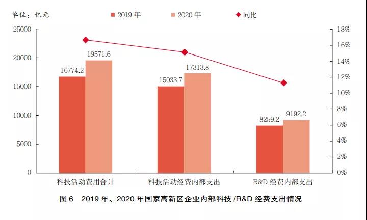 截至2020年年底,169家国家高新区的16.5万家企业科技活动经费内部支出17313.8亿元,较上年同比增长15.2%;企业R&D经费内部支出9192.2亿元(参见图6),较上年同比增长11.3%,占全国企业R&D经费支出的49.2%;国家高新区企业研发经费支出与园区生产总值(GDP)比例为6.8%,是全国研发经费支出与国内生产总值比例(2.4%)的2.8倍。国家高新区企业的研发投入强度处于较高水平。