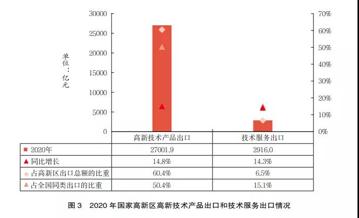 国家高新区鼓励企业积极开拓和利用国际市场,加快调整和优化企业出口贸易结构,重点发展高附加值的高新技术产品和技术服务出口。从总量上看,2020年国家高新区出口规模稳中有升,同比增长8.1%;高新区企业出口总额占营业收入的比重10.5%,占比较2019年小幅收窄;国家高新区出口总额占全国外贸出口(货物及服务出口198683.1亿元)的比重达到22.5%,较2019年上涨0.9个百分点。同时,国家高新区出口贸易结构进一步优化,国家高新区企业高新技术产品出口总额为27001.9亿元,技术服务出口总额2916.0亿元,分别较2019年同比增长14.8%、14.3%。国家高新区企业高新技术产品出口总额占全国高新技术产品出口(53573.7亿元)比重为50.4%,占比较上年提升3.8个百分点;国家高新区企业实现技术服务出口总额占全国服务出口(19356.7亿元)比重为15.1%,较2019年占比提高了2.1个百分点;高新区高新技术产品出口和技术服务出口占高新区出口总额比重分别为60.4%和6.5%(参见图3)。国家高新区通过调整和优化出口贸易结构等形式,不断提升企业参与国际贸易的水平和层级,高新技术产品出口和技术服务出口表现出较好发展势头。