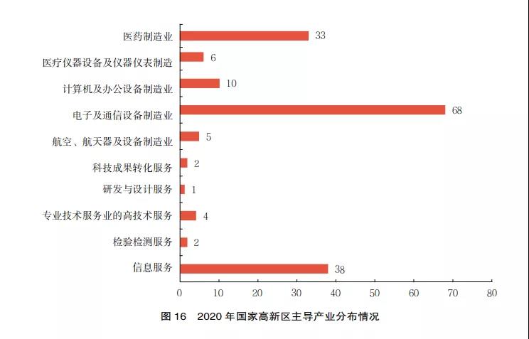 调查问卷显示,全部国家高新区均制定了明确的产业规划,且大多数高新区都建立了形式多样、功能各异的产业促进机构(数据来源:调查问卷;样本量N=169)。按照国民经济行业分类中符合高技术制造业、高技术服务业的产业范畴将169家国家高新区的企业进行产业划分,以营业收入进行计算,选取高技术制造业/服务业中营业收入最大的产业作为该高新区的主导产业,结果显示,2020年,国家高新区高技术制造业/服务业的主导产业主要集中10大类别中,其中,高技术制造业中以电子及通信设备制造业为主导产业的高新区最多,共68家;高技术服务业中以信息服务为主导产业的国家高新区最多,共38家(参见图16)。