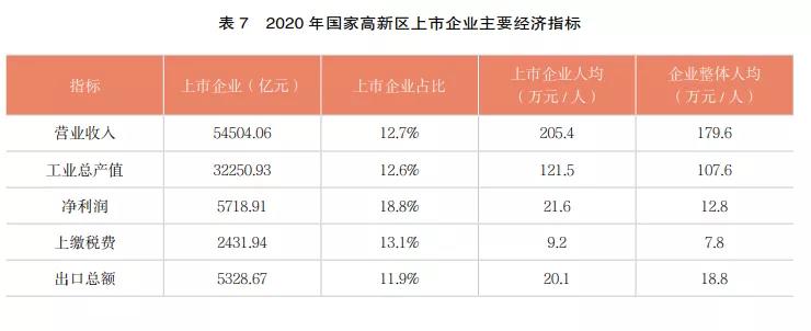 国家高新区上市企业实力强大,经济效率效益领先发展。2020年,169家国家高新区共有1684家上市企业主体,占高新区企业总数的1.0%,但上市企业主要经济指标占国家高新区的比例均超过11%,上市企业经济规模在国家高新区的占比是数量占比的10倍以上。上市企业的人均营业收入、人均工业总产值、人均净利润、人均上缴税费、人均出口总额分别为205.4万元/人、121.5万元/人、21.6万元/人、9.2万元/人、20.1万元/人,上市企业各项人均指标均高于园区企业总体的人均指标(参见表7);上市企业的净利润率为10.5%,高于高新区企业平均水平3.4个百分点。