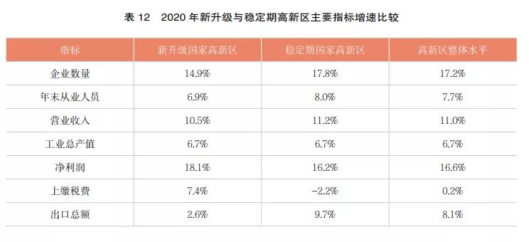 2020年,115家新升级高新区营业收入同比增长10.5%,工业总产值同比增长6.7%,净利润同比增长18.1%,上缴税费同比增长7.4%,出口总额同比增长2.6%(参见表12)。新升级高新区虽然经济总量还难以匹敌稳定期高新区,但主要经济指标增速相对较快,呈现出迅猛增长的态势。综合来看,新升级高新区还需要进一步建立健全火炬统计工作机制,提高统计工作的科学性。当然,也因为新升级高新区产业规模较小、经济基础相对较弱,从而能够实现相对较快的增长速度,这也为新升级高新区实现赶超式发展提供了现实可能。