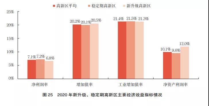 新升级高新区的净利润率、增加值率、工业增加值率和净资产利润率分别为6.8%、20.5%、21.3%和12.0%。其中,新升级高新区的净资产利润率较全国高新区平均水平高出1.8个百分点,而净利润率、增加值率和工业增加值率则分别低于全部高新区平均水平0.4个百分点、0.7个百分点和1.5个百分点(参见图25)。可以看出,新升级高新区效率型指标整体偏低,新升级高新区在推动园区创新驱动高质量发展上任重道远。