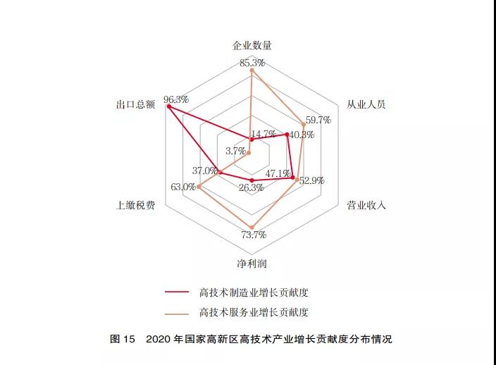 2020年国家高新区高技术产业中属于高技术制造业的企业为20578家,占高新区统计企业的12.4%,占比较上年下降0.5个百分点;属于高技术服务业的企业共计69551家,占高新区统计企业的42.1%,占比较上年上升2.8个百分点;高技术服务业企业数量为高技术制造业企业数量的三倍多。从主要经济指标来看,高技术制造业依然在经济总量方面占据绝对力量,特别是高技术服务业的产业特性决定了其出口总额要远低于高技术制造业;从增长率来看,高技术服务业增长更快,除出口总额外,高技术服务业主要指标增速均高于高技术制造业的增长率(参见图14)。从2020年国家高新区高技术产业增长贡献度分布情况也可以看出:高技术服务业在创造新的工作岗位、扩大就业方面贡献很大,高技术服务业净利润首次在总量上超过高技术制造业,高技术服务业的盈利性开始突显,另外,高技术服务业上缴税费的贡献度也逐步趋近高技术制造业。同时可以看出,由于国家高新区持续推进产业结构调整,越来越多的国家高新区布局和发展高技术服务业,高技术服务业在企业数量贡献度上已经远超过高技术制造业(参见图15)。国家高新区在调结构、转方式等方面的效果日益凸显,高技术服务业正在成长为支撑高新区发展的重要力量。