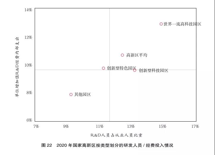 2020年,三类园区在R&D人员和R&D经费方面均有较高的投入强度。通过对各类型国家高新区的R&D人员占从业人员比重和单位增加值R&D经费内部支出进行分析发现,世界一流高科技园区依然属于R&D人员和R&D经费投入双高的第一象限,由于创新型科技园区数量减少,创新型科技园区在R&D人员和R&D经费投入方面的优势已经不明显。其他国家高新区虽然属于R&D人员和R&D经费投入较低的第四象限,但高新区整体平均水平依然较强(参见图22)。不同类型国家高新区在科技活动投入方面梯度发展的趋势愈发明显。