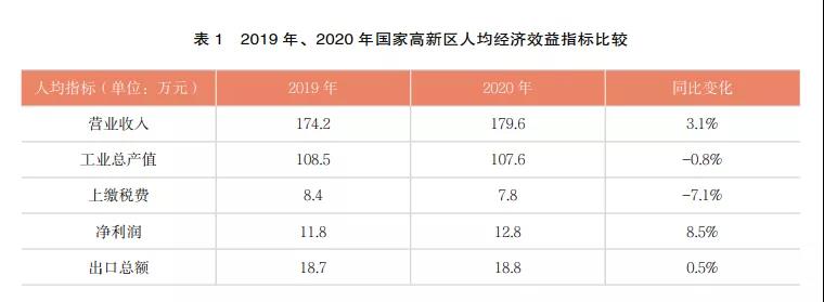 国家高新区坚持科技创新的发展方式,促进生产效率不断提升,人均享有的社会经济资源和成果持续维持在较高水平。2020年,国家高新区企业人均创造价值有升有降,其中人均工业总产值、人均实际上缴税费较上年有所回落。2020年,国家高新区人均营业收入、人均工业总产值、人均净利润、人均上缴税费、人均出口总额分别为179.6万元、107.6万元、12.8万元、7.8万元、18.8万元(参见表1)。2020年国家高新区的劳动生产率为36.6万元/人,是全国全员劳动生产率(13.5万元/人)的2.7倍,国家高新区依然是全国经济效率的高地。