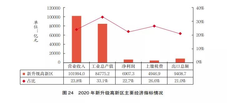 115家新升级国家高新区覆盖了27个省、直辖市、自治区,在“以升促建”过程中实现了较快发展,已成为地方经济增长的主阵地、产业转型升级的先行区、创新创业的引领区和新型城镇化的带动区。截至2020年年底,115家新升级高新区纳入火炬统计的3.6万家企业实现营业收入101994.0亿元、工业总产值84775.2亿元、净利润6907.3亿元、上缴税费4946.9亿元、出口总额9408.7亿元,占全部国家高新区的比例分别为23.8%、33.1%、22.7%、26.6%和21.0%(参见图24)。新升级高新区在经济体量上占全部国家高新区的比重还比较小。新升级高新区要紧密围绕国家高新区内涵特征和价值使命,以新经济理念推进高新区创新驱动发展,以深化改革创新激发发展动力和活力,结合资源禀赋、产业特征和区位优势等基础,加快形成各具特色的发展格局。