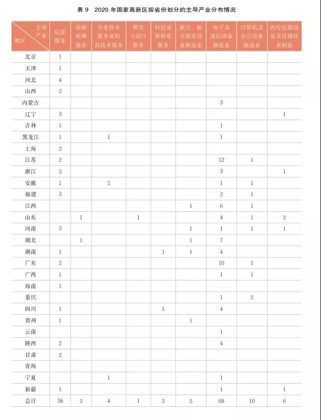 同时,各国家高新区的主导产业在部分地区有趋同的趋势,不考虑只有一家国家高新区的省份,2020年的数据显示江苏省、广东省、湖北省等地多家高新区的主导产业相同(参见表9),国家高新区通过顶层设计、政策引导等方式建立超越地缘优势的创新型产业集群已经渐现成效。