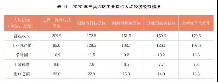 从人均产出看,世界一流高科技园区依然表现突出,人均营业收入、人均净利润、人均上缴税费分别为209.9万元、16.9万元和8.6万元(参见表11),在国家高新区整体人均创造价值中处于高位;而创新型科技园区的人均工业总产值和人均出口总额在三类园区中是最高的,分别达到128.5万元和22.9万元。