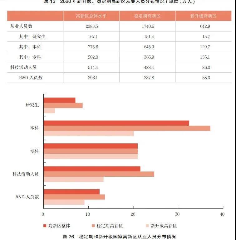 新升级高新区人力资源结构进一步优化调整。截至2020年年底,新升级高新区入统企业的从业人员期末数为642.9万人,占高新区从业人员总数的27.0%。按学历划分,大专学历135.1万人、本科学历129.7万人、研究生学历15.7万人,分别占新升级高新区从业人员总数的21.0%、20.2%和2.4%(参见表13、图26),新升级高新区人员结构呈现出持续优化的状态。新升级国家高新区从业人员中科技活动人员86.0万人,其中R&D人员58.3万,R&D人员占科技活动人员比重67.8%,高于稳定期国家高新区R&D人员占比。综合来看,新升级高新区高层次人员结构占比明显低于稳定期高新区,且部分指标占比只有约国家高新区总体水平的一半,新升级高新区从业人员整体素质还有待进一步提升。