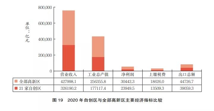随着自由贸易试验区向纵深拓展,多个区域出现自由贸易试验区与自主创新示范区叠加的局面,部分园区拥有自创区和自贸区两大“金字招牌”,迎来一系列发展机遇,这些园区以自创和自贸“双自联动”,充分利用国际国内“两个市场、两种资源”,进一步实施先行先试政策,促进制度创新、开放创新、金融创新和科技创新的多维度融合,推动人才、资本、技术、知识等多要素资源联动,加强产学研、内外资、政社企的多主体协同,促进科技、金融、贸易、产业的多维度融合,着力打造国际化循环、全球化配置的创新创业生态系统,促进制度创新、开放创新、金融创新、科技创新的深度融合,不断提升区域发展质量与效益。2020年,21家国家自主创新示范区内高新区共实现营业收入326190.2亿元、工业总产值177117.4亿元、净利润23949.5亿元、上缴税费13509.3亿元、出口总额39059.3亿元,分别占169家国家高新区的76.2%、69.1%、78.7%、72.5%、87.3%,是国家高新区的中坚力量。(参见图19)。