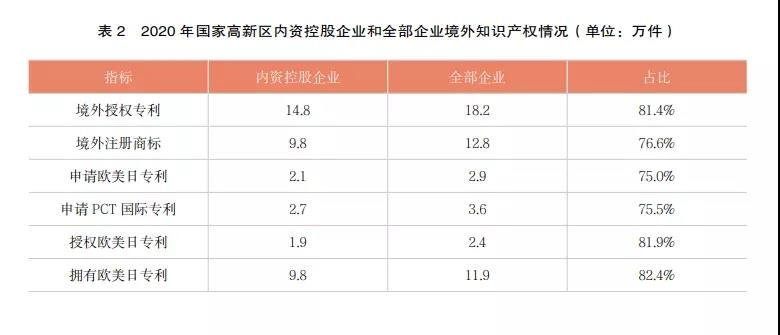 国家高新区大力促进企业国际知识产权创造、运用、保护和管理,支持企业申请境外专利、注册商标。截至2020年年底,国家高新区企业拥有境外授权专利18.2万件,其中授权境外发明专利14.1万件,拥有境外注册商标12.8万件,共有304家企业参与国际标准的制定;其中,内资控股企业拥有境外专利14.8万件,拥有境外注册商标9.8万件,共有264家内资控股企业参与形成国际标准的制定,内资控股企业境外知识产权数量占全部企业的比重均超过70%(参见表2)。