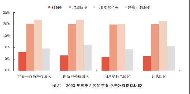 从效益型指标看,三类园区的经济效益相对较好,但又各有千秋。2020年,三类园区内企业合计的利润率、增加值率、工业增加值率和净资产利润率分别为7.3%、20.2%、21.5%和9.9%(参见图21)。其中,10家世界一流高科技园区的各项效率型指标数据表现整体较好,具有一定的引领带动作用;创新型科技园区的净资产利润率则表现最为突出;但创新型特色园区表现差强人意,还需持续发力。