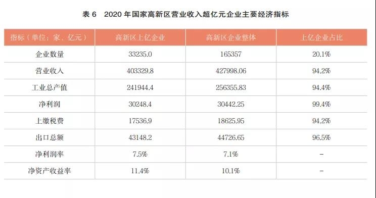 国家高新区亿元以上规模企业的经济体量庞大,经济效益表现突出。2020年,国家高新区内营业收入超过亿元的企业共计实现营业收入、工业总产值、净利润、上缴税费和出口总额分别为403329.8亿元、241944.4亿元、30248.4亿元、17536.9亿元、43148.2亿元占高新区整体的比例均超过94%(参见表6),也就是说,企业数量占比五分之一的上亿企业贡献了园区94%以上的经济规模。同时,2020年国家高新区内上亿元企业的净利润率和净资产收益率为7.5%和11.4%,分别高于高新区企业平均水平0.4和1.3个百分点。