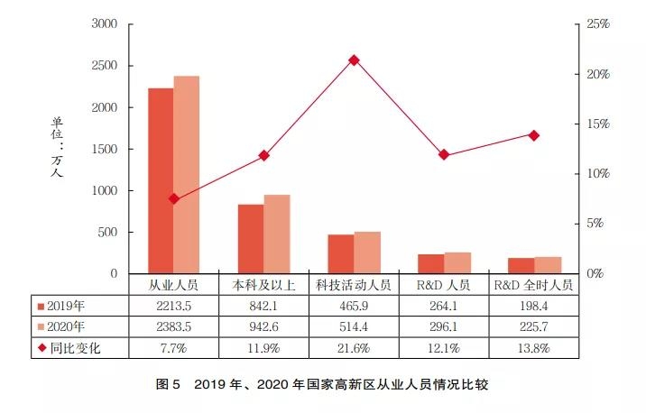国家高新区以优厚政策聚拢人才、以优质服务留住人才,始终坚持以高标准招人聚才与立体化培育人才并举,逐步建立起一支规模宏大、富有创新精神、敢于承担风险的创新型人才队伍,成为全国的创新人才高地。2020年,国家高新区企业从事科技活动人员514.4万人,占全部从业人员总数的21.6%,占比较2019年提高0.5个百分点;高新区企业中专业技术人员671.8万人,占全部从业人员总数的28.2%。从业人员中,本科及以上学历人员数为942.6万人、R&D人员296.1万人、R&D人员全时人员数为225.7万人,分别较2019年同比增长11.9%、12.1%、13.8%。相较于高新区从业人员7.7%的增长速率,可以看出,高学历人才和科技活动人员的增长速率高于从业人员的平均增速(参见图5),国家高新区的从业人员队伍整体的结构不断优化。2020年,国家高新区每万名从业人员中R&D人员折合全时当量为849.0人年,是全国每万名从业人员中R&D人员(67.8人年)的12.5倍。超过91.7%的国家高新区都在积极培养技术创新支持人才,包括科技创业(风险)管理人才、技术评估人才、技术经纪人才、知识产权服务人才等(数据来源:调查问卷;样本量N=169)。