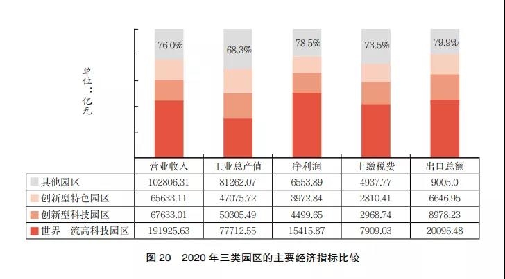 2020年,10家世界一流高科技园区纳入统计的企业为7.3万家,18家创新型科技园区纳入统计的企业为2.6万家,29家创新型特色园区纳入统计的企业为2.9万家。从主要经济指标的总量来看,世界一流高科技园区、创新型科技园区和创新型特色园区三类园区的主要经济指标占国家高新区总体的三分之二以上(参见图20)。