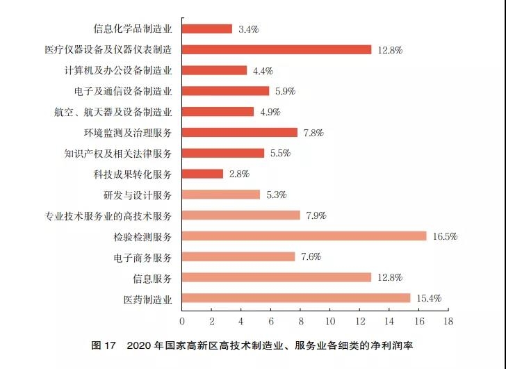 2020年,国家高新区通过科学的产业规划、高效的政策引导促进园区产业健康发展,国家高新区重点发展研发投入强度较高的高技术产业,集聚效应初步显现。2020年,国家高新区内高技术产业的净利润率为9.1%,高于高新区平均水平2个百分点,其中,属于高技术制造业的企业平均净利润率为7.4%,属于高技术服务业的企业平均净利润率11.3%。六类高技术制造业和八类高技术服务业分类中,共有8个类别的高技术产业利润率高于高新区平均水平,其中,医药制造、信息服务、医疗仪器设备及仪器仪表制造、检验检测服务的利润率超过10%,检验检测服务的利润率更是高达16.5%(参见图17)。