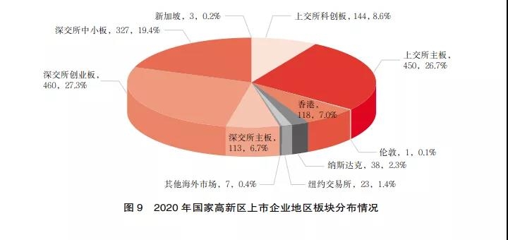 2020年,国家高新区内共有上市企业主体1684家,较2018年增加208家。按上市地点对169家高新区内的上市公司主体进行划分,在境内上市1494家,占比88.7%,在境外上市190家,占比11.3%。境内上市的1494企业上市市场分布为:深交所主板上市113家,中小板上市327家,创业板上市460家,上交所主板上市450家,科创板上市144家;境外上市的190家企业主要上市市场分布为:香港118家,纳斯达克38家,纽约交易所23家,新加坡3家,伦敦1家,其他境外地区市场总计7家(参见图9)。