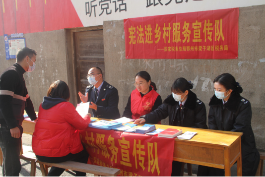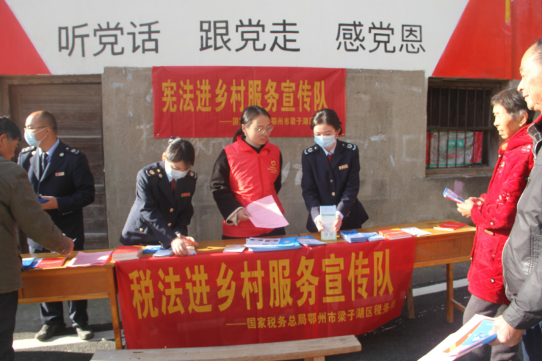(本网讯)为进一步弘扬宪法精神,深入学习宣传习近平法治思想,向广大群众宣传法治思想,推动宪法宣传走入日常生活,提升普法宣传的实效。12月2日,在第八个国家宪法日即将到来之际,梁子湖区税务局“三师”普法宣传队来到对口普法联系村沼山镇杨井村开展宪法进乡村主题宣传活动。