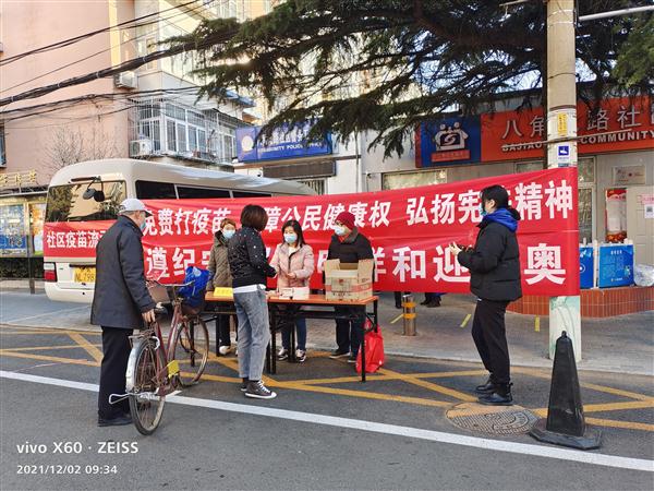 在疫苗流动接种车旁设置宪法宣传台,并利用接种疫苗居民等候和留观的时间,向居民发放宪法手册和民法典单行本,宣讲宪法精神。让居民在接种疫苗的同时也将法治的理念深入到心中,同时能够带动家人、朋友积极接种疫苗,自觉宣传宪法。