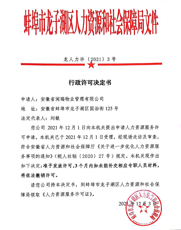 关于安徽省闽瑞物业管理有限公司的行政许可决定书