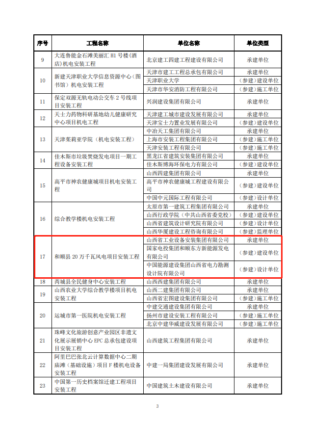 近日,2021-2022年度第一批中国安装工程优质奖(中国安装之星)入选工程公示名单揭晓,由集团第六工程公司承建的和顺县20万千瓦风电项目安装工程位列其中,顺利荣获“中国安装之星”荣誉。