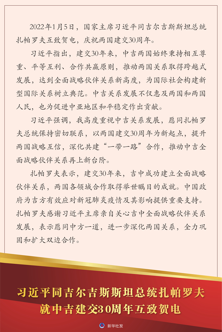 新华社北京1月5日电 2022年1月5日,国家主席习近平同吉尔吉斯斯坦总统扎帕罗夫互致贺电,庆祝两国建交30周年。