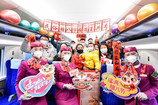 农历腊八节到来之际,在中国铁路成都局集团有限公司贵阳客运段动车一队值乘的C5980次“复兴号”动车组列车上,列车工作人员邀请旅客品尝腊八粥、张贴“福”字、悬挂灯笼,感受传统文化魅力。
