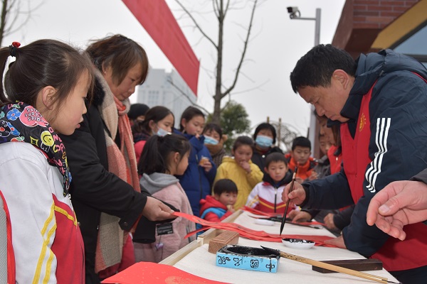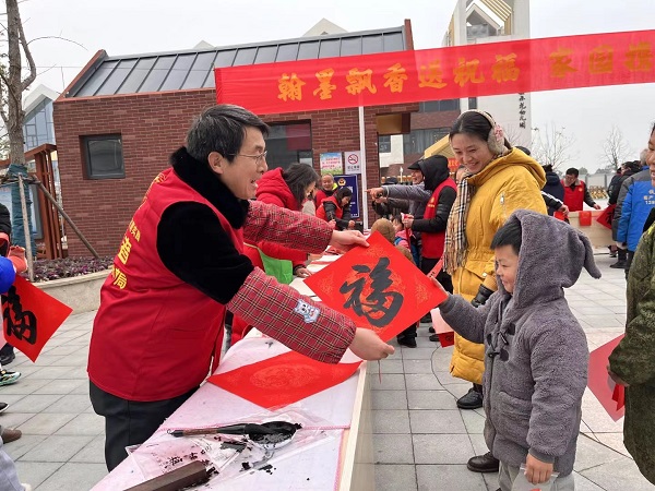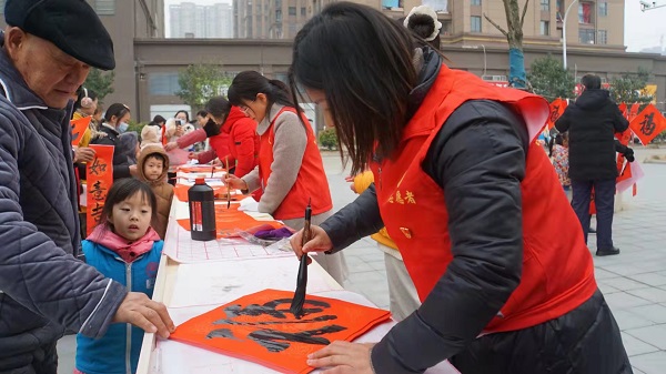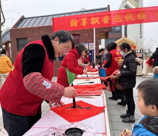 长桌一字排开,红纸、笔墨一应俱全,书法爱好者们将浓浓祝福倾注笔端,一笔一划间流露出翰墨的馨香。他们饱蘸浓墨,从笔画到神韵,一丝不苟、凝神静气,楷书、隶书、行书多种书体缤纷上场。