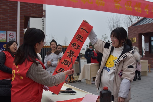 一幅幅带着美好寓意的春联,一个个满含喜庆祝福的”福“字,字里行间洋溢着新春的喜悦。家长们兴高采烈的举着春联拍照合影留念,形成了一道靓丽的风景线,每个人脸上都洋溢着笑容。虽然寒意习习,但活动现场的温暖势不可挡。