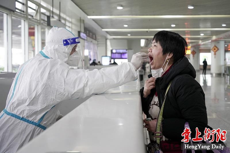 ▲1月11日,在南岳机场,中高风险地区返衡旅客接受核酸检测