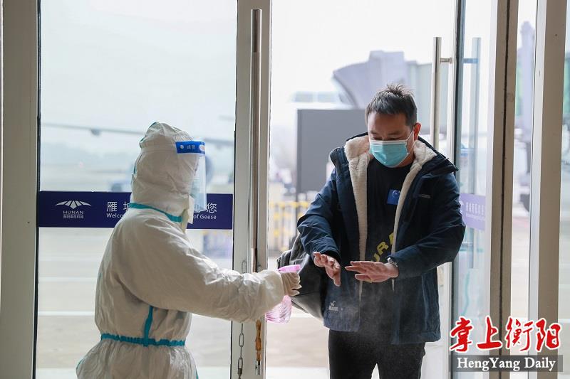 1月11日,南岳机场,工作人员对入衡旅客开展手部清洁消毒工作。面对当前疫情防控严峻形势,南岳机场针对入境入衡旅客实行全面强化疫情防控措施,严格落实防疫要求,切实构建好疫情防控“闭合圈”体系,为我市疫情防控守好第一道关口。