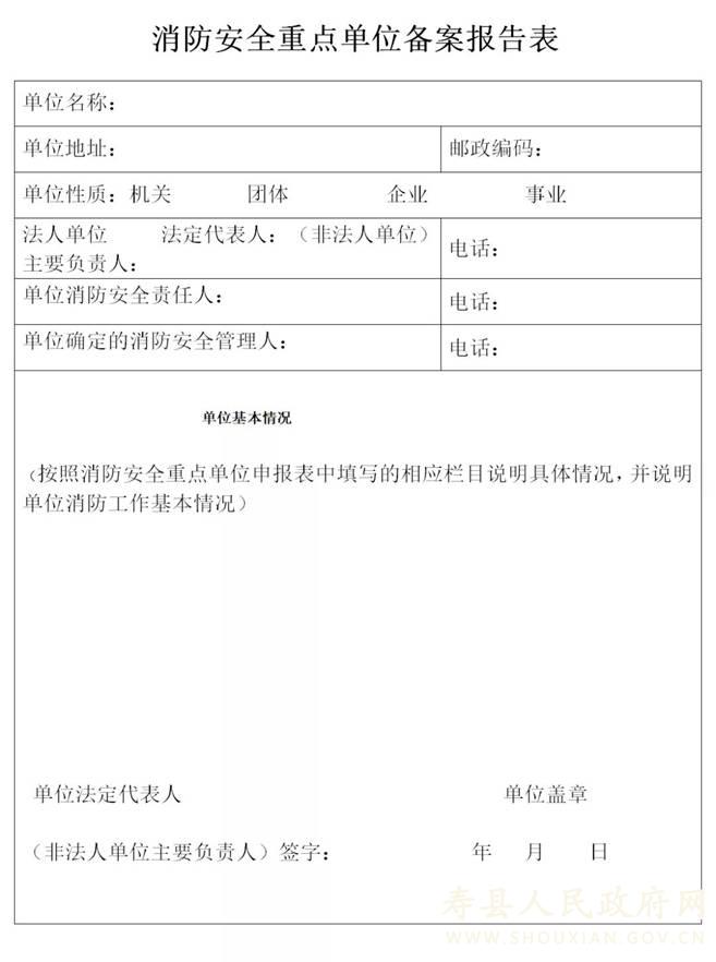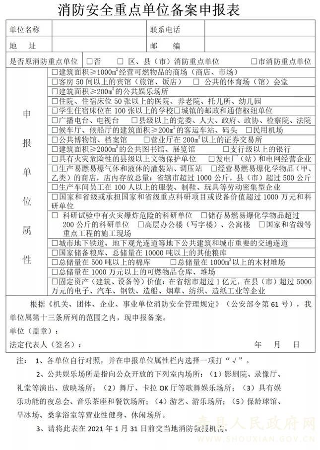 依据《中华人民共和国消防法》、《机关、团体、企业、事业单位消防安全管理规定》等法律法规,督促社会单位落实消防安全主体责任,现将安徽省消防安全重点单位界定标准向全社会进行公布,请全县各社会单位对照标准,认真自查,凡符合界定标准的单位,应于2022年1月20日前填写《消防安全重点单位备案申报表》并加盖公章,主动向县消防救援大队进行申报登记,并实行严格管理。