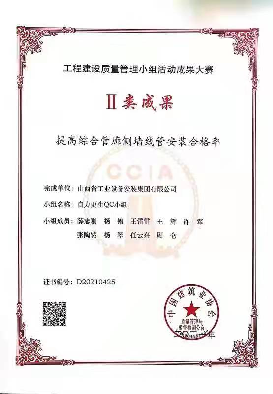 近日,市政路桥工程公司QC小组成果《提高综合管廊侧墙线管安装合格率》荣获中国建筑业协会工程建设质量管理小组活动成果大赛Ⅱ类成果。