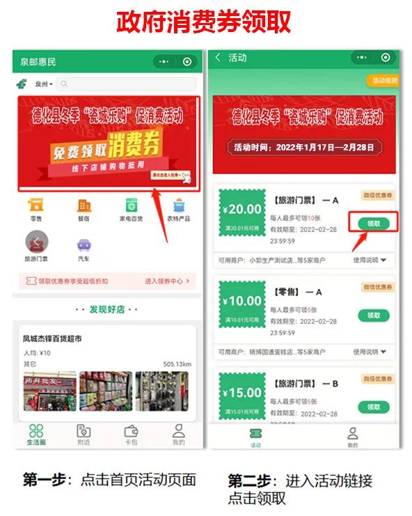 1.消费券通过微信小程序“泉邮惠民”商城首页领取