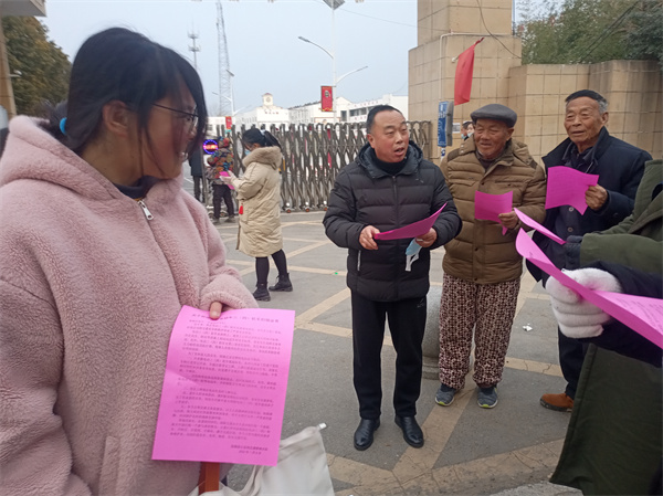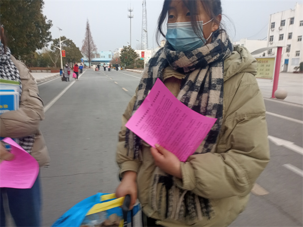 教导处孟建主任亲自在学校大门口给来接孩子的家长发倡议书。孟主任一边发送一边讲解:为了你和家人的安全,请家长们自觉遵守交通法规,不驾驶没有注册登记上牌的电动三(四)轮车;符合上牌规定的电动车要及时上牌办证;严禁老年人骑电动三(四)轮车接送孩子上下学!
