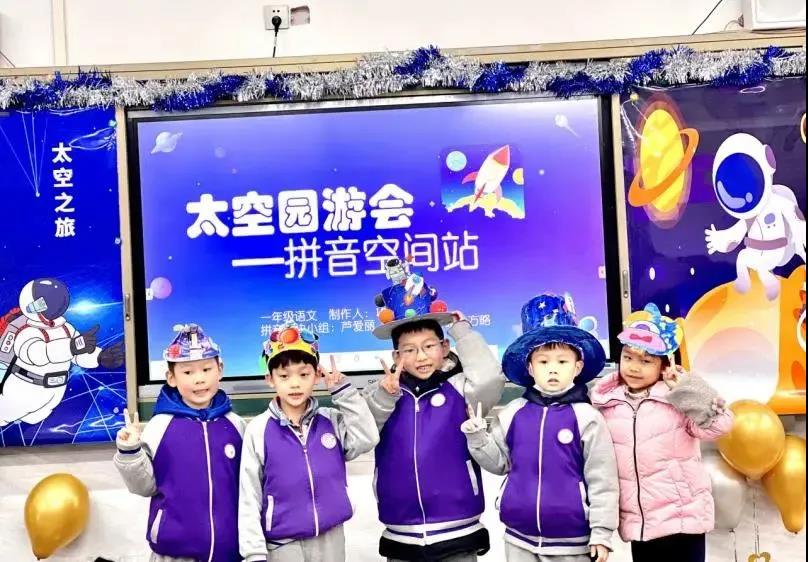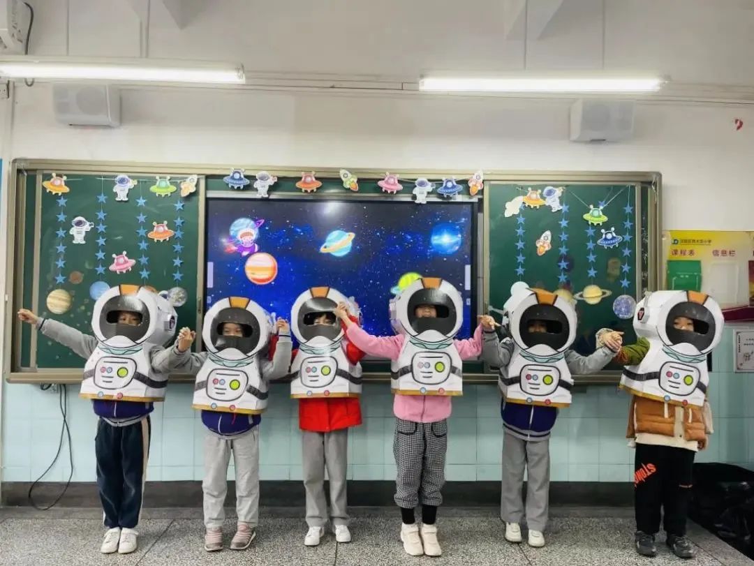 西大街小学的学生戴上自制的航天头饰闯关“拼音空间站”