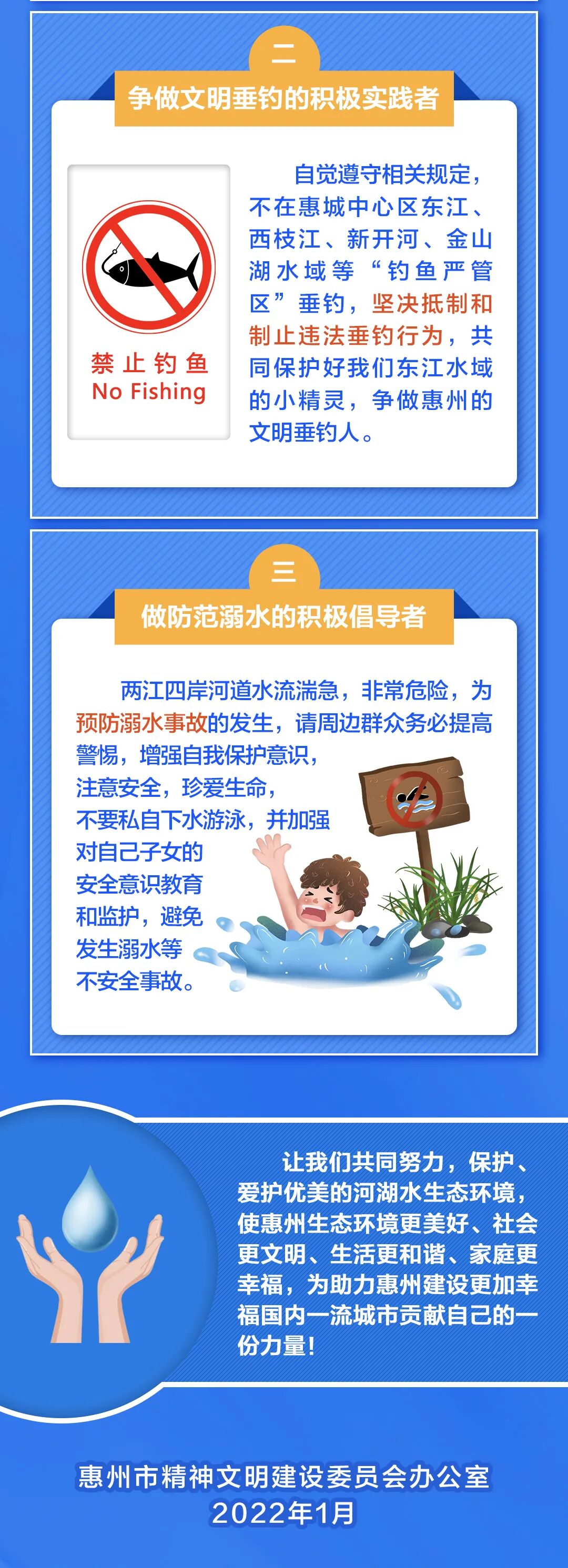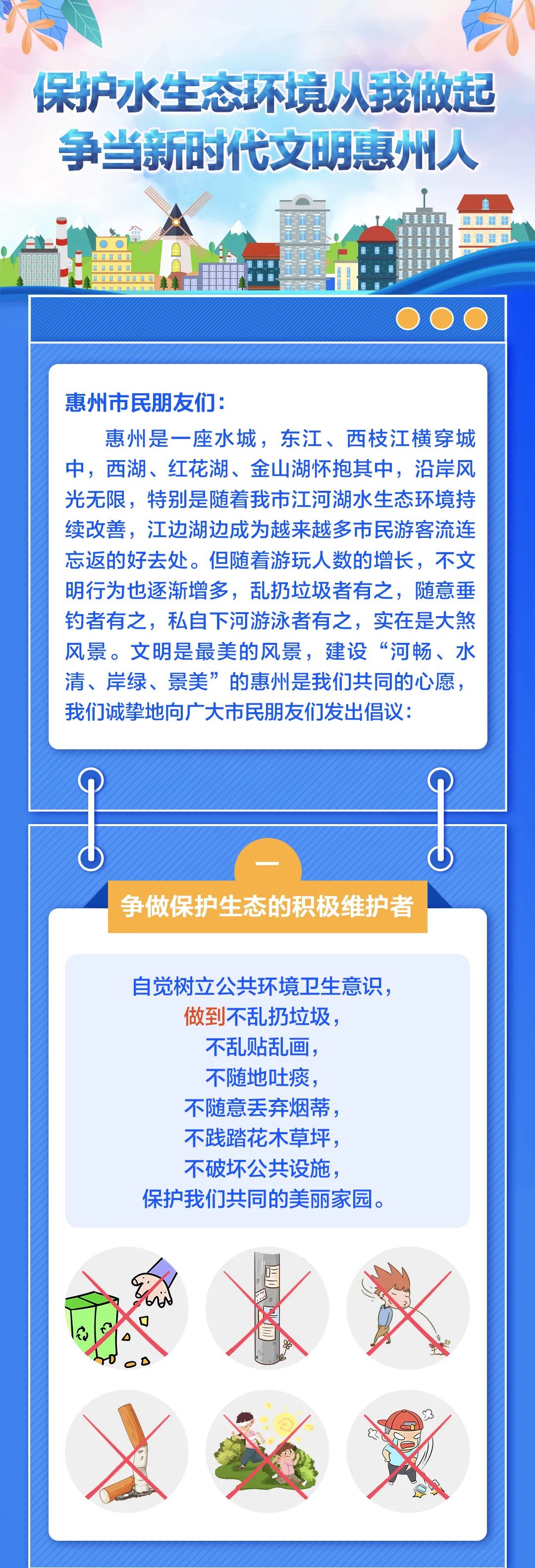 近日,惠州市河长办发出《保护水环境 建设幸福河湖倡议书》,倡议全市人民立即行动起来,爱护河湖生态、保护水环境,积极参与到“保护水环境,建设幸福河湖”行动中来。 “水是生命之源、生产之要、生态之基,水环境直接关系我们的生存环境和生活品质,关系着区域生态环境和经济社会的可持续发展。” 据市河长办介绍,近年来,随着河湖长制的全面深入推进,全市河湖面貌显著改善,初步呈现“水清岸绿、鱼翔浅底、水草丰美、白鹭成群”的景象,成为市民群众休闲、观光、亲水的好去处。但目前在河岸上乱扔垃圾、违规垂钓的不文明现象仍然存在,严重影响了全市水域环境卫生和市容景观。 “保护河湖健康,维持干净、整洁、有序的河道环境,是我们共同的义务。”市河长办倡议,一要爱护河湖生态。不往河里扔垃圾、排放污水,不围垦湖泊,不非法采砂,不在河边违规烧烤野炊,游玩产生的垃圾随身带走。二要文明垂钓。不在河湖禁钓区违规垂钓,在可钓区文明垂钓,废弃物务必随身带走;不进行炸鱼、电鱼、毒鱼等行为。三要保持堤岸整洁。不在河滩地及河堤垦荒种菜,不侵占河道,不在河湖管理范围内乱占、乱堆、乱建。四要保护水利工程设施。不毁坏堤防、护岸等河道配套设施,不损毁水源地保护标志牌、河湖长制公示牌等涉水标识。五要强化保护责任。爱护河湖生态、保护水环境是一种社会责任,广大市民对发生在身边的污染水资源、破坏河湖水环境的不良现象要进行监督和抵制。 “爱护河湖人人有责,保护水环境需要我们每个人从小处做起,从身边做起,需要全社会的共同努力。我们相信有您的爱心呵护,惠州河湖一定会更加清洁美丽,人民生活将更加幸福精彩!”市河长办倡议:亲爱的市民朋友们,让我们进一步增强爱河、护河意识,把爱护河湖生态、保护水环境作为一种思想自觉和行动自觉,为给我市建设珠江东岸新增长极、粤港澳大湾区高质量发展重要地区和更加幸福国内一流城市提供水资源保障尽一份心、出一份力。 惠州依山伴湖、拥江抱海、风景优美。一到假节日,江边湖边就聚集了很多游玩的市民。希望大家能文明出游,共同维护好我们“河畅、水清、岸绿、景美”的惠州。为此,我们倡议: