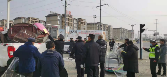 本着“一天突击两乡镇”的部署,会同相关部门,分批次、有步骤、按节奏地推进拆篷行动:1月14日,杨庙乡、湖沟镇,拆除车篷50多顶;1月15日,新马桥镇、刘集镇,拆除车篷40多顶;1月16日,石湖乡、任桥镇,拆除车篷30多顶;1月17日,仲兴乡、连城镇,拆除车篷70多顶。下一步,执法队员们还将和有关部门一起,将拆篷行动覆盖到每一个乡镇。