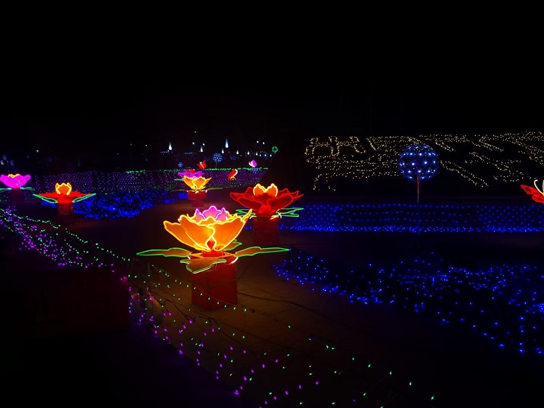 据悉,水之印广场主要以“天地相方”主题景观亮化为主,在其周围制作“荷塘月色”景观,并对周围绿篱用网灯进行亮化,在广场绿地草坪上布设麦穗、郁金香等灯饰,在广场舞台北侧布设电子烟花,对广场四周树木用串灯、造型挂件进行装饰;水如意生态绿地亮化主要分布在水如意生态绿地一区(县电影院后面)和二区(县教体局后面),为达到新颖、美观的效果,工作人员根据所栽植树木的品种和栽植地形地点的不同,微妙惟肖的悬挂不同款式的灯笼和不同色彩的灯带。整个亮化设计造型美观、颜色靓丽、霓虹闪烁、交相辉映,烘托了温馨祥和的节日氛围,打造城区独具特色的节日亮化夜景。