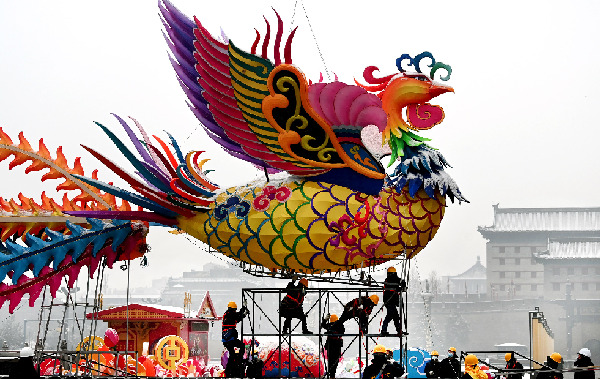 1月23日,施工人员在西安市南门广场组装龙凤吉祥灯饰。 随着西安市17个区县、开发区有序恢复正常生产生活秩序,原本冷清的大街、公园被阵阵欢声笑语填满,人们走出家门,用热气腾腾的生活迎接虎年的到来。