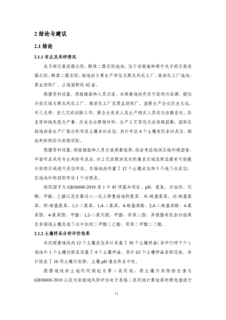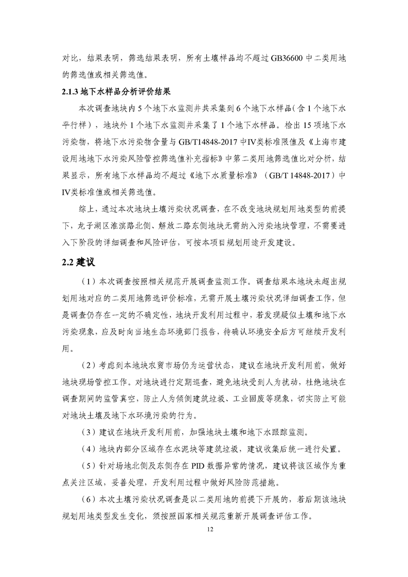 通过本次地块土壤污染状况调查,在不改变地块规划用地类型的前提下,龙子湖区淮滨路北侧、解放二路东侧地块无需纳入污染地块管理,不需要进入下阶段的详细调查和风险评估,可按本项目规划用途开发建设。