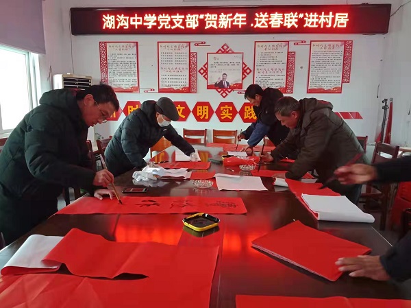 固镇县湖沟中学党支部组织党员教师到湖沟镇中心村举行写春联送祝福活动