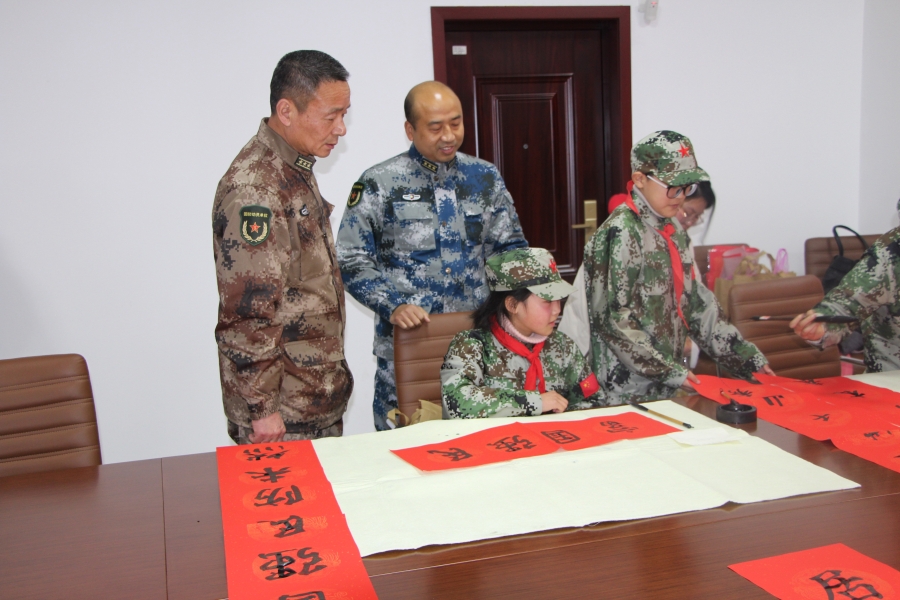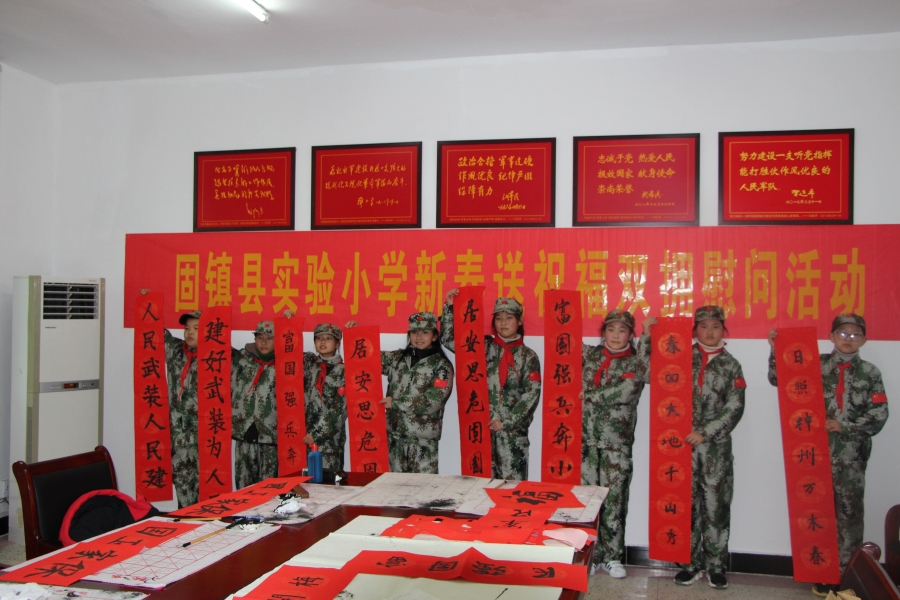 实验小学师生代表先后来到固镇县人武部和固镇县武警中队,向全体官兵致以节日的慰问,并送上诚挚的祝福。孩子们凝神聚气,提起毛笔,蘸满墨汁,认真地书写着每一幅春联。“居安思危固国防 富国强兵奔小康”“建好武装为人民 人民武装人民建”……一幅幅喜庆的大红春联飘逸着墨香,寄托着对来年的新希望和新祝福,同时也表达了他们对“最可爱的人”的崇高敬意。
