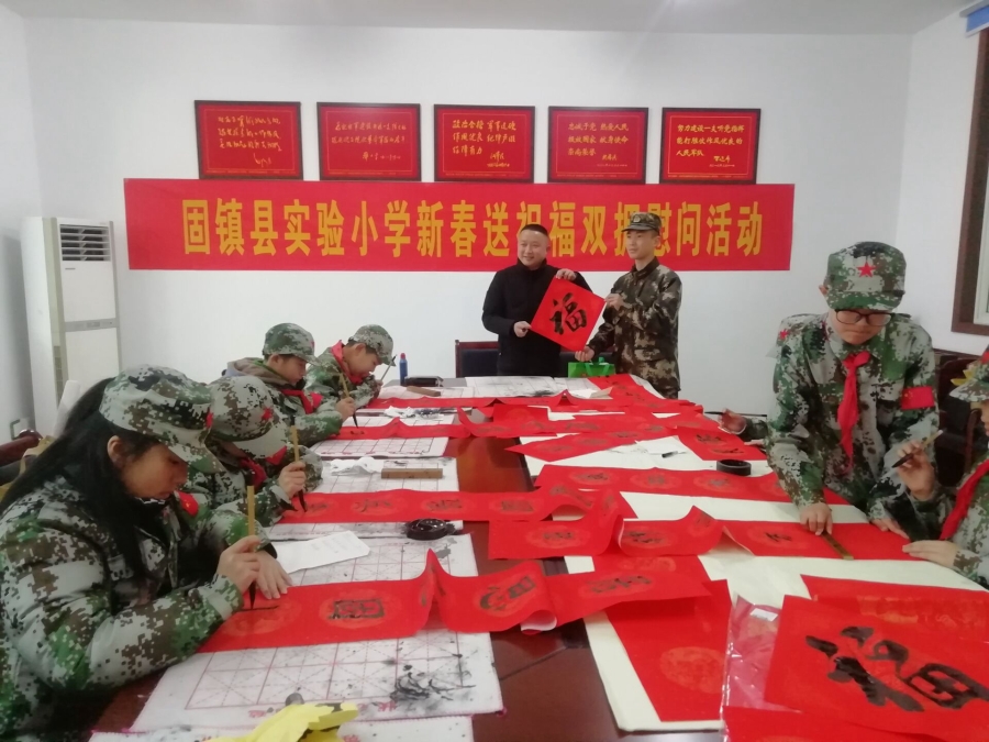 写春联,送祝福;鱼水情,一家亲。为发扬拥军优属、军民团结的优良传统,弘扬固镇书法之乡文化底蕴,让学生在‘双拥”实践活动中受到熏陶、接受教育,树立从小好好学习、长大报效祖国的远大志向。2022年1月28日下午,固镇县实验小学开展了春节双拥慰问活动。