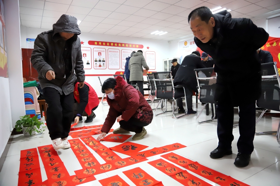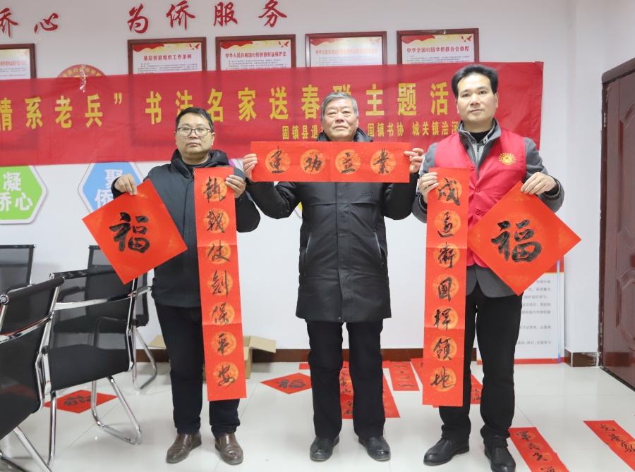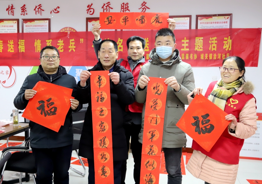 “戍边卫国捍领地,执戟仗剑保平安”、“昔日从戎为祖国,今朝创业兴家园”等一副副既体现尊军元素又表达美好祝福的春联在固镇县浍河社区展开来,书法艺术老师现场挥毫,墨香四溢。退役军人事务局副局长单民主热情地将“新鲜出炉”的春联和“福”字赠送给退役军人代表——曾参加过对越自卫反击战的老战士王健,并向他致以节日的祝福。