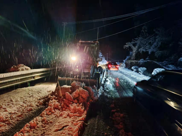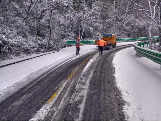 截至1月29日上午,黄山市公路系统累计投入铲雪车、装载机等机械40余台、公路职工200余人,连夜清除雪阻路段37处、设置警示标志79块、抛洒融雪剂2300余公斤、清理倒塌竹木11处,确保了各条公路安全通行。