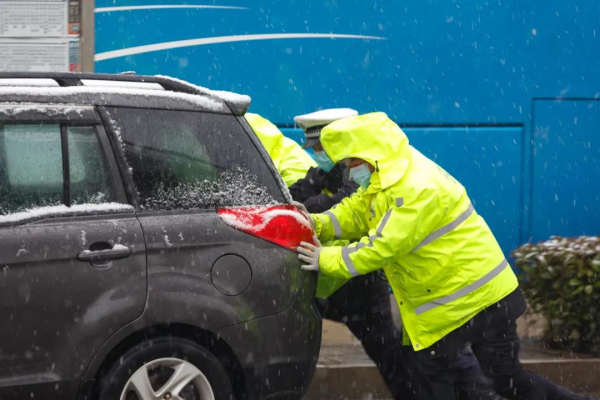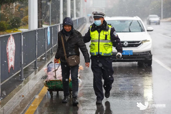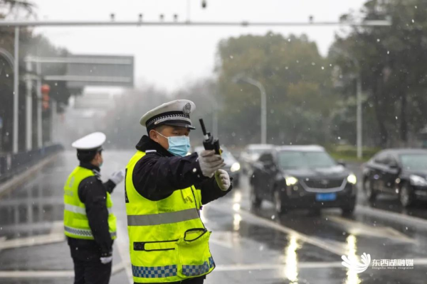 1月28日,大雪如期而至。东西湖警方启动雨雪冰冻恶劣天气应急预案,迅速开展应对工作。